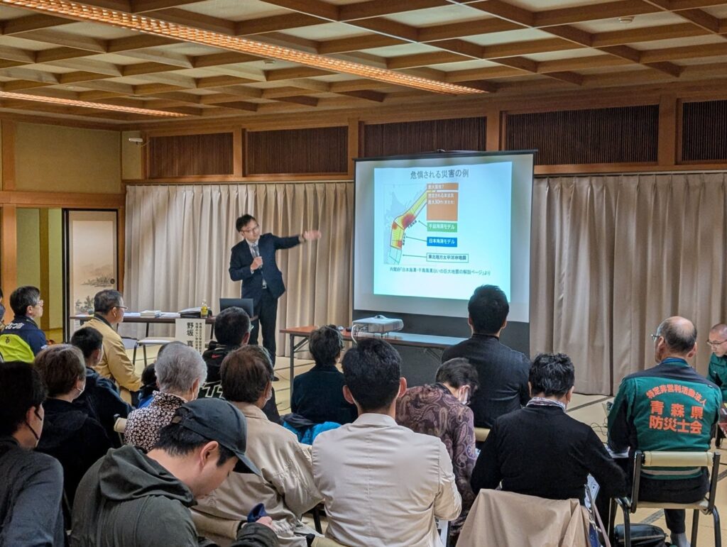 想定される巨大地震による津波災害を自分ごととして考えて、自助の力、共助の力を強めるため、青森公立大学野坂真准教授を講師に招き、大畑防災学習会を開催しました。