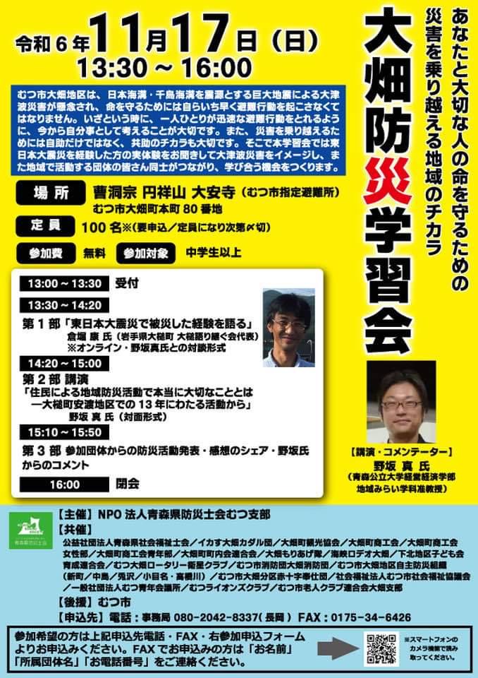 むつ市指定避難所の大畑町大安寺を会場に、地域の方々、社会福祉士会、商工会、消防団など諸団体の関係者約100名の参加者が、東日本大震災で被災した岩手県大槌町の体験談に耳を傾けて、災害への備え、対応を考えました。オンラインでつないだ大槌語り継ぐ会倉堀康代表は「災害が発生したらまずは自分の命を守ってほしい。それが周りの人の命を助ける事にもつながる」と強調されました。とても貴重な教訓です。