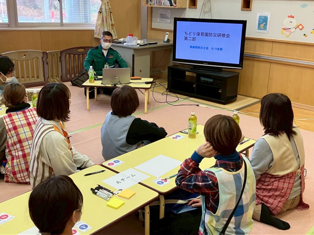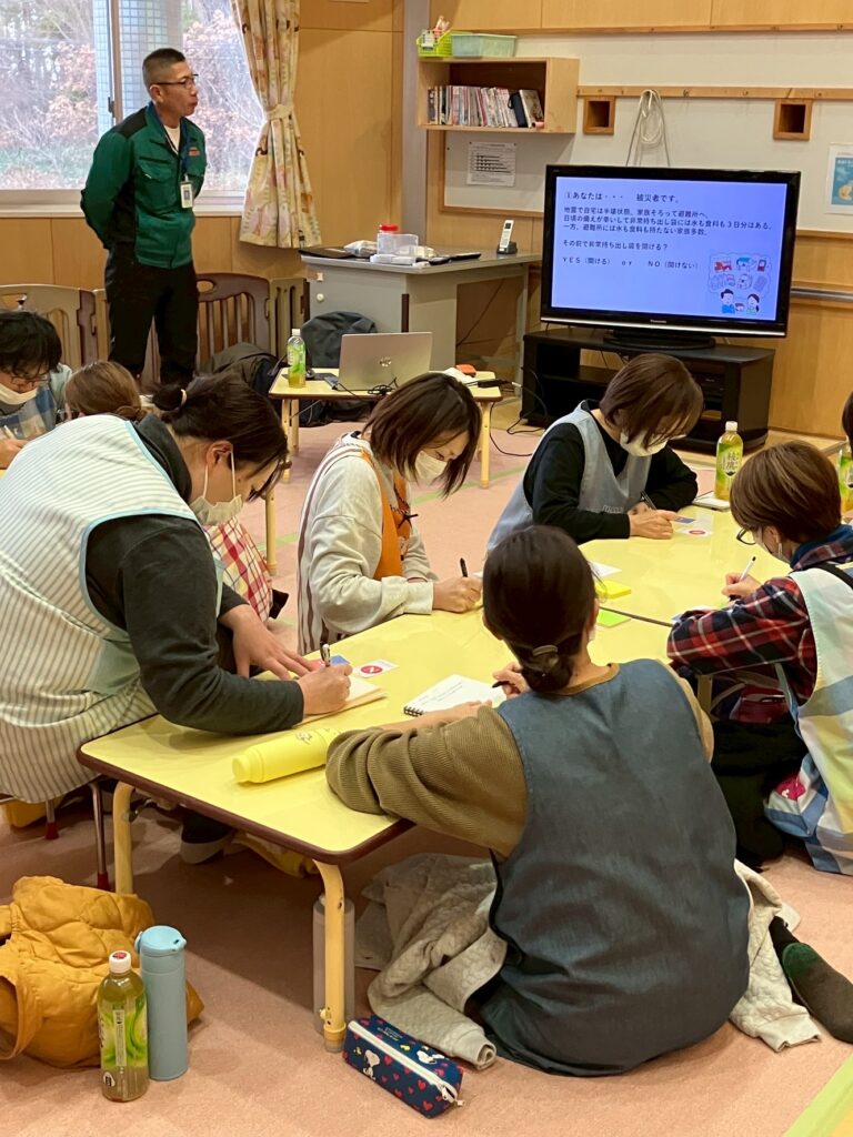 12月8日に青森県東方沖地震があり加えて後発地震注意情報が発令されている中での研修会でしたので、職員の皆さんには高い関心を持って参加いただきました。災害対応を「自分事」として捉え、災害に対し備えることの重要性、考えるだけではなく行動に移すことの大切さを共有でき、また園児たちの安全をどう確保するか、そのために今後関係機関や保護者とどう連携を構築するかといった「園児ファースト」に基づいた活発な意見交換がされ、とても有意義な研修となりました。